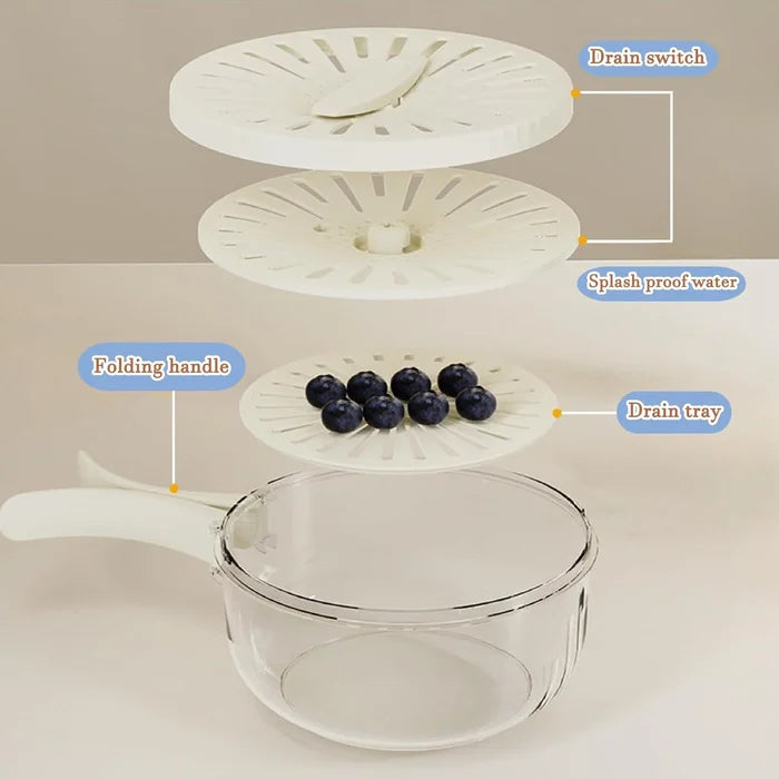 Design multifuncional: Nossa tigela multifuncional para lavar frutas e vegetais é projetada com uma peneira interna removível para filtrar, um recipiente externo transparente para armazenamento e uma cobertura hermética para manter o conteúdo fresco, oferecendo uma experiência agradável do usuário.